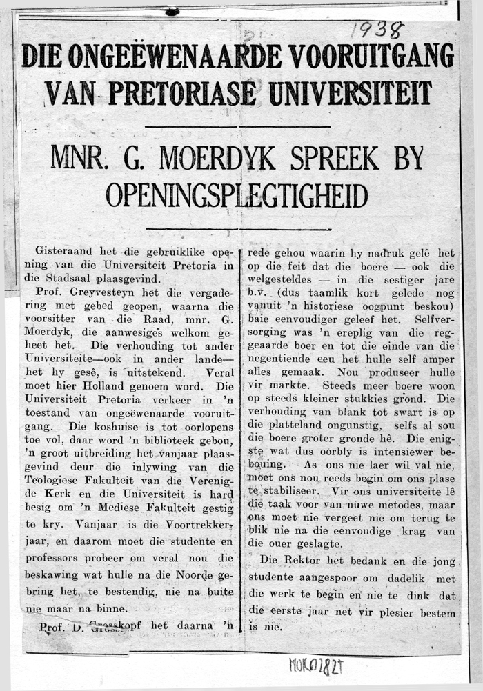 Mnr. G. Moerdyk spreek by openingsplegtigheid oor die ongeëwenaarde vooruitgang van Pretoriase Universiteit