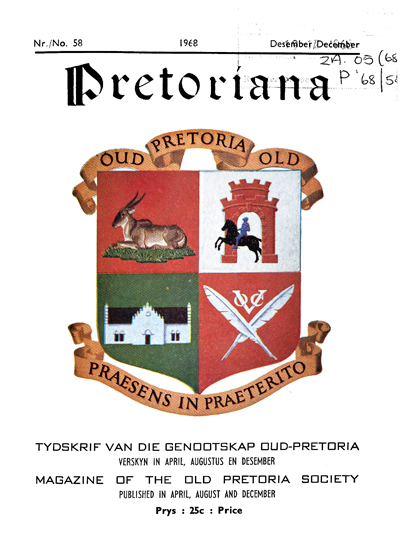 Onthulling van gedenkplaat Kya Rosa -- Toespraak van Dr. N.A. Coetzee (Voorsitter van Genootskap Oud-Pretoria) by geleentheid van die onthulling van die gedenkplaat by Kya Rosa op 21 Oktober 1978 -- Voorgeskiedenis van terrein waar Kya Rosa staan ... / N.A. Coetzee -- Onthulling van gedenkplaat : toespraak van Mnr. W.W. Haak, 1908 student -- Die straatname van die Pretoriase voorstad Danville / G.J. van Eck -- Die straatname van Danville se uitbreiding no. 1 / G.J. van Eck -- Vernoeming van park in Villieria / G.J. van Eck -- Nog 'n brief uit die boerelaer te Ladysmith / J.F. de Man -- The occupation of Pretoria by the British forces (II), taken from war letters from the veld A.D. 1900 / by C.R. Prance -- The Pretoria Club / A.K.W. Atkinson -- Laerskooltuinkompetisie, 1968 / H. Bruins-Lich