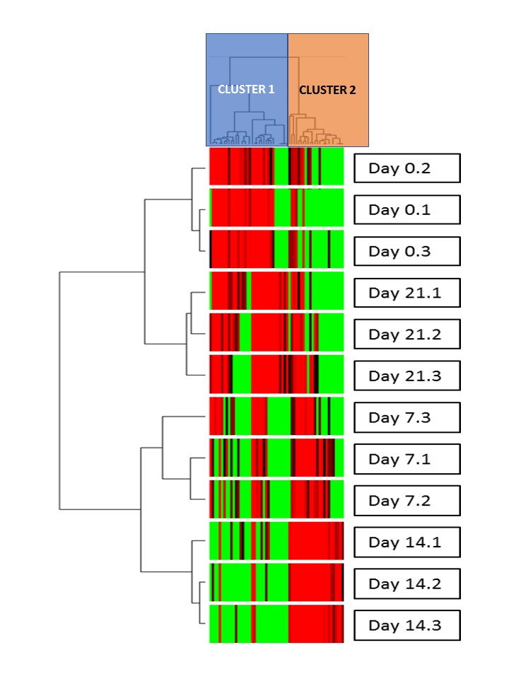 FIGURE S2 : Cluster image generated by Java TreeView (Saldanha, 2004) of the proteins obtained after LC-ESI-MS/MS analysis of total protein isolated from RYNO3936 before (day 0), and after induction of water stress (days 7 and 14), and after recovery and regrowth (day 21). Red bands show up-regulated proteins, whereas green bands show down-regulated proteins.