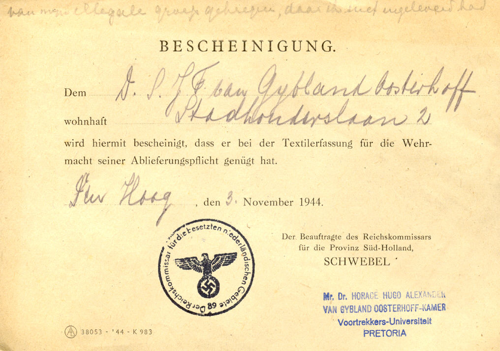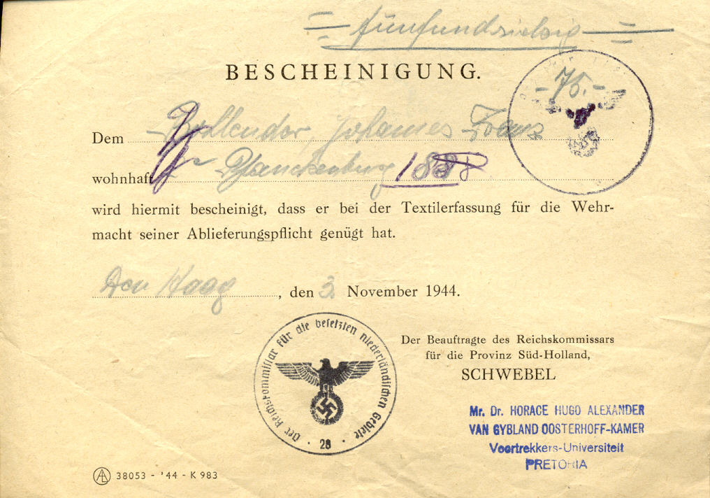 Schwebel, Certificate, Textilerfassung, Bescheinigung, Second World War
