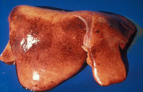 Rift Valley fever (RVF) markedly enlarged liver, yellow-brown discolouration of the organ, and congested patches scattered throughout the organ