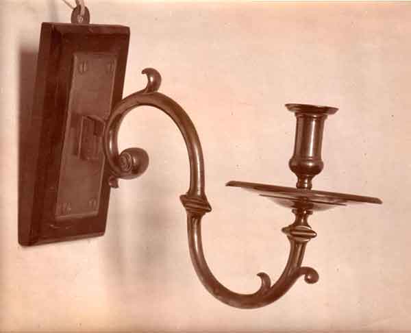 Photograph depicting a brass wall sconce at Groot Constantia. It could be removed for cleaning. See also p. 162, Fig. 186 (photographed by Arthur Elliot) on p. 164 and Plate 58 of the 1960 edition of "Eighteenth Century Furniture in South Africa" by G. E. Pearse.