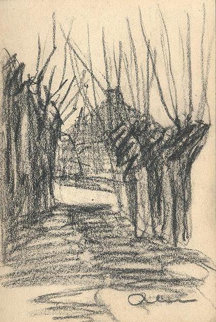 Charcoal drawing of a road between trees leading up to a building, signed by Reus, bottom right.