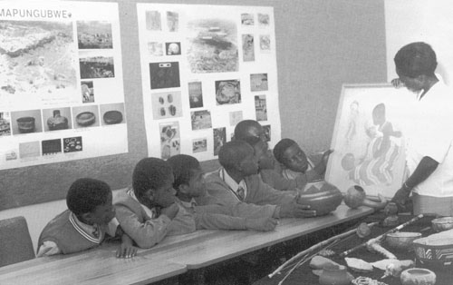 | dc.description.abstract | Ms. Irene Mafune, a post graduate student of the Department of Anthropology and Archaeology at the University of Pretoria (right) explaining the significance of Mapungubwe, its gold objects and traditional artefacts to a group of learners from the Pretoria Boys’ High School. | en |
