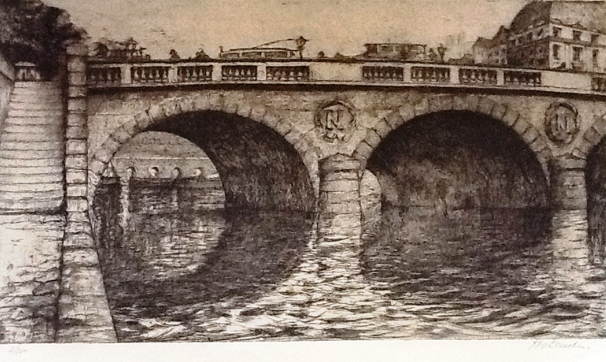 Dry needle etching of the Bridge Pont Saint Michel, Paris, 1857. The 'N' on the side of the bridge is clearly visible, signed W v Leusden bottom right. Marked 2/100 and titled "No 90 Parys - 12:50".