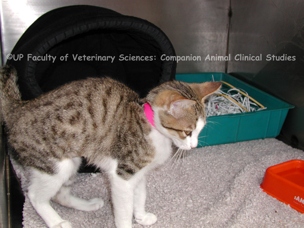 PHOTO 1: Kittens suspected of having an illness require immediate care. The patient should be encouraged to eat and drink water. The kitten should be weighed up to four times daily to record weight gain and to identify when it is losing weight or failing to gain weight. Mucous membranes can be assessed for moistness to determine the patient’s hydration status. Kittens should be supplied with fresh water, a litter box and a warm place to sleep. PHOTO 2: There are several behavioural characteristics that are associated with pain and discomfort in cats and dogs. The animal may become reluctant to move, lie down or change positions. Other common behavioural signs of pain are vocalization, restlessness, inappetence and depression. PHOTO 3: A hunched posture may be an indication of abdominal pain. Facial expression like a fixed stare or squinting may also suggest abdominal pain in the patient. It is however difficult to assess pain in feline patients and many cats will merely sit still in the back of a cage when in pain. There is an extensive list of causes of abdominal pain, since any portion of the abdomen could be the source of pain. PHOTO 4: It is more difficult to identify the signs of ocular pain in cats than in dogs. One of the features of ocular pain is retraction of the globe. This can be easily observed in the dog but it may not be as apparent in felines. Squinting may also be a sign of ocular pain. Other indications of ocular pain include spasms of the muscle in the eyelid, photophobia and excessive secretion and discharge of tears. PHOTO 5: An igloo may be provided to feline patients that have to be kept in the hospital for observation. Not only will an igloo provide a warm and comfortable place for the patient to rest and sleep but it also creates an environment that will feel safe and secure to the patient.