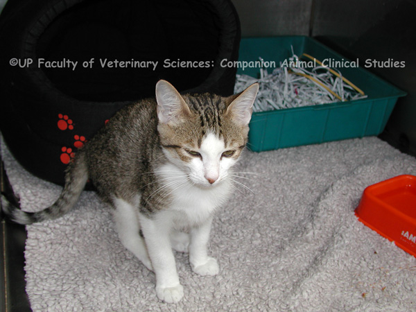 | dc.description.abstract | PHOTO 1: Kittens suspected of having an illness require immediate care. The patient should be encouraged to eat and drink water. The kitten should be weighed up to four times daily to record weight gain and to identify when it is losing weight or failing to gain weight. Mucous membranes can be assessed for moistness to determine the patient’s hydration status. Kittens should be supplied with fresh water, a litter box and a warm place to sleep. PHOTO 2: There are several behavioural characteristics that are associated with pain and discomfort in cats and dogs. The animal may become reluctant to move, lie down or change positions. Other common behavioural signs of pain are vocalization, restlessness, inappetence and depression. PHOTO 3: A hunched posture may be an indication of abdominal pain. Facial expression like a fixed stare or squinting may also suggest abdominal pain in the patient. It is however difficult to assess pain in feline patients and many cats will merely sit still in the back of a cage when in pain. There is an extensive list of causes of abdominal pain, since any portion of the abdomen could be the source of pain. PHOTO 4: It is more difficult to identify the signs of ocular pain in cats than in dogs. One of the features of ocular pain is retraction of the globe. This can be easily observed in the dog but it may not be as apparent in felines. Squinting may also be a sign of ocular pain. Other indications of ocular pain include spasms of the muscle in the eyelid, photophobia and excessive secretion and discharge of tears. PHOTO 5: An igloo may be provided to feline patients that have to be kept in the hospital for observation. Not only will an igloo provide a warm and comfortable place for the patient to rest and sleep but it also creates an environment that will feel safe and secure to the patient. | en |