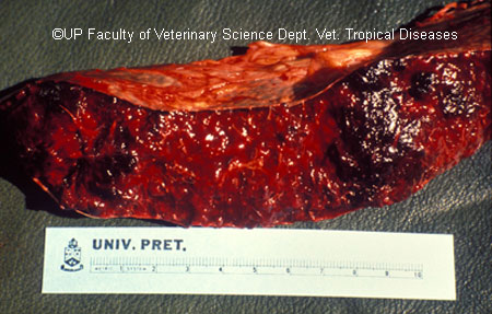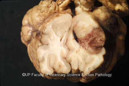 Turning sickness or cerebral theileriosis is an uncommon aberrant form of infection by Theileria parva or Theileria taurotragi in which lymphoblasts parasitized by schizonts accumulate in cerebral vessels leading to thrombosis and infarction. In the more acute form areas of intense congestion and haemorrhage are present in the meninges and brain which are associated with areas of softening (Infarction) and discoloration of brain tissue. Thrombosed meningeal vessels are often very promiment. There may be severe haemorrhage into the ventricles. Histological examination shows the obstruction of arteries and arterioles by large numbers of parasitized lymphoblasts associated with haemorrhage and encephalomalacia. Similar lesions may occur in the spinal cord and infarcts may be present in the spleen.