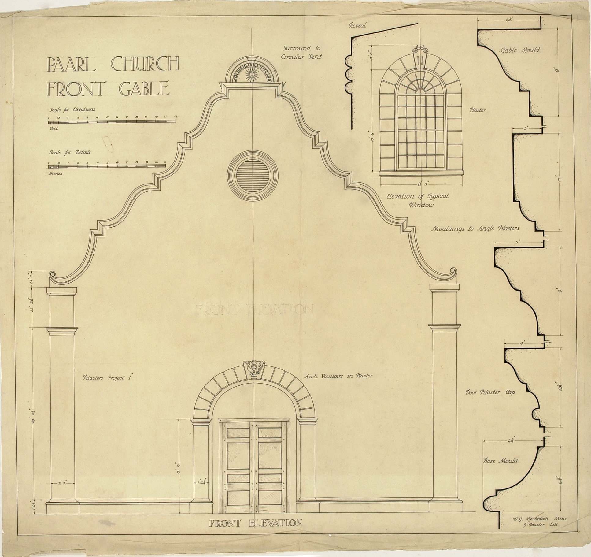 Front elevation with gable of the Paarl Church, measured by Gordon McIntosh and drawn by John Fassler for prof. Geoffrey Pearse's book "Eighteenth Century Architecture in South Africa" – see page 48 for a description, and Plates 98 and 99 for the drawing and a photograph by R. M. Ellenberger. The unusual gable with its bull's eye ventilator combines elements of the convex-concave and pointed apex gables.