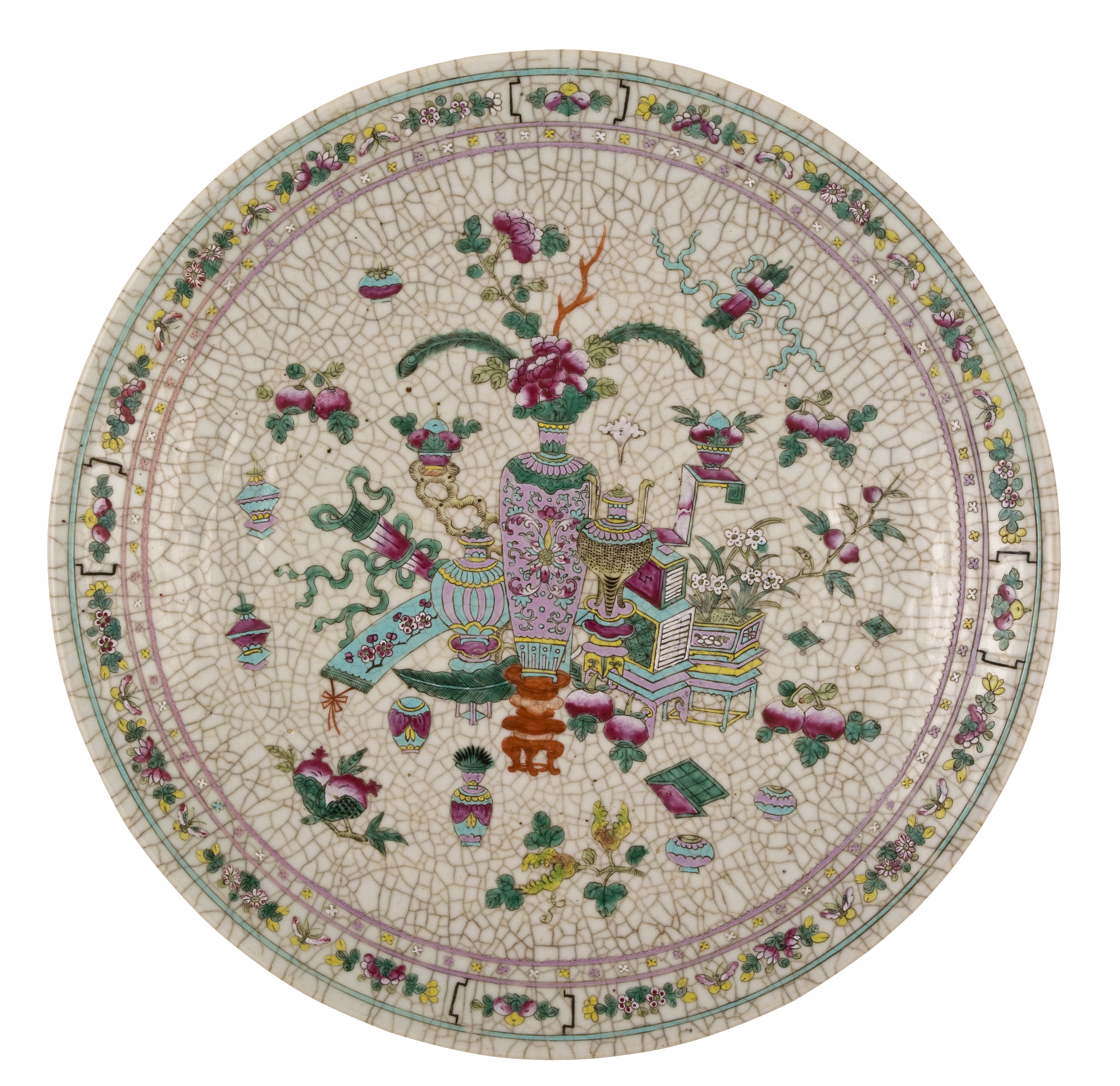 This large porcelain dish is covered with a thick crackled glaze and decorated with precious Buddhist objects and a floral border in overglaze enamels. The base is sunken, glazed and marked with 4 Kangxi character marks in blue. Originally on the back of this dish was an inscription that read: “Coloured with agate and precious stones”.