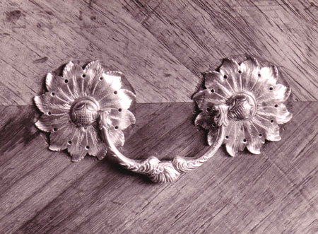 Photograph depicting an ornamental silver drawer handle. It appears to be from mrs. Gordon's coromandel chest of drawers, not original but copied from a box at Koopmans de Wet House. It is shown in Fig. 142 on p. 116 of the 1960 edition of prof. Geoffrey Pearce's book "Eighteenth Century Furniture in South Africa". See also description on p. 114.