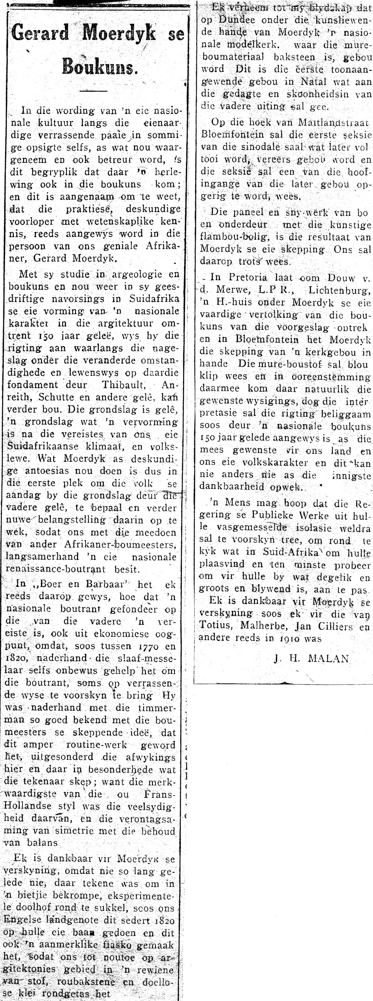 In die wordings van 'n eie nasionale kultuur langs die eienaardige verrassende paaie in sommige opsigte selfs vreemder as wat nou waargeneem en ook betreur word, is dit begryplik dat daar 'n herlewing ook in die boukuns kom, en dit is aangenaam om te weet dat die praktiese, deskundige voorloper met wetenskaplike kennis, reeds aangewys word in die persoon van ons geniale Afrikaner, Gerard Moerdyk.