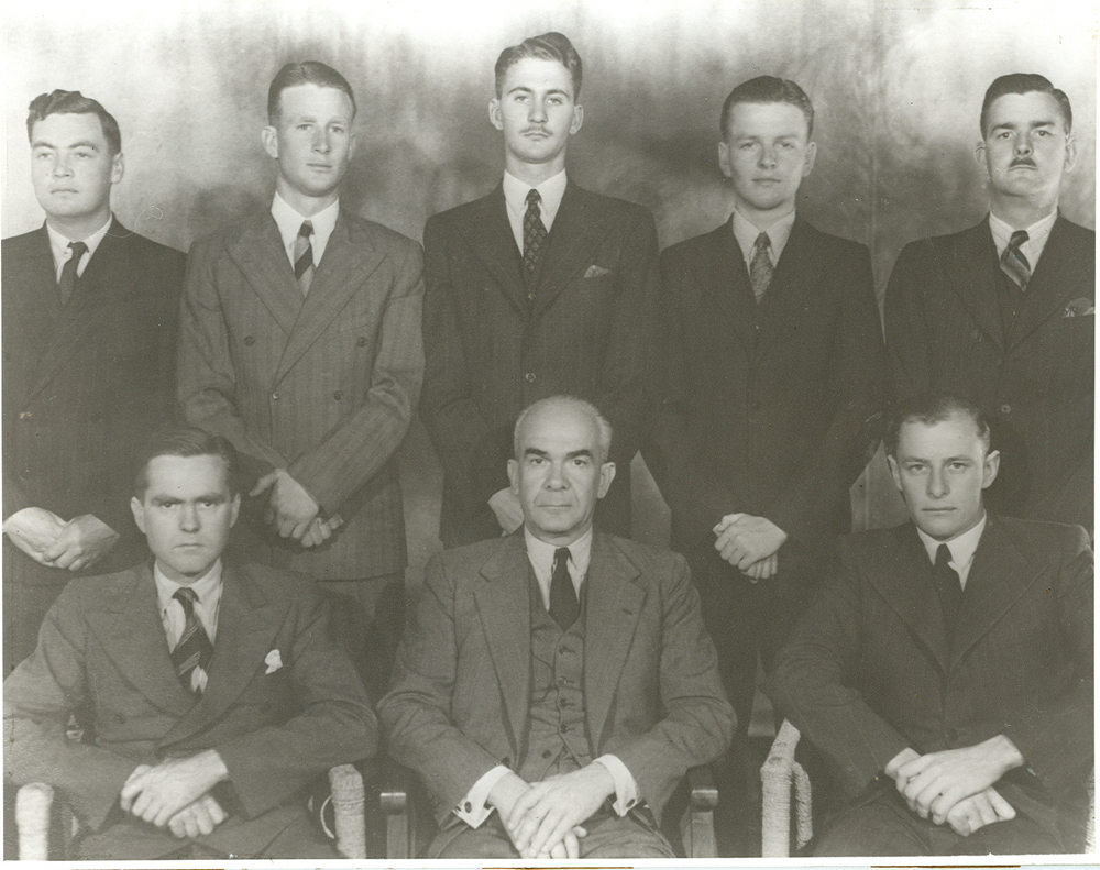 Consisting of 7 students, the graduates of 1944 class photo is a customary comprehensive one with the Dean of the Faculty, Dr (Prof.) PJ du Toit. The names from front (from left to right): Dr D Haig, Prof Dr PJ du Toit, PG Joubert ; Second row: TCW Wessels, BC Jansen, LW van den Heever, FW Langbridge, J Louw