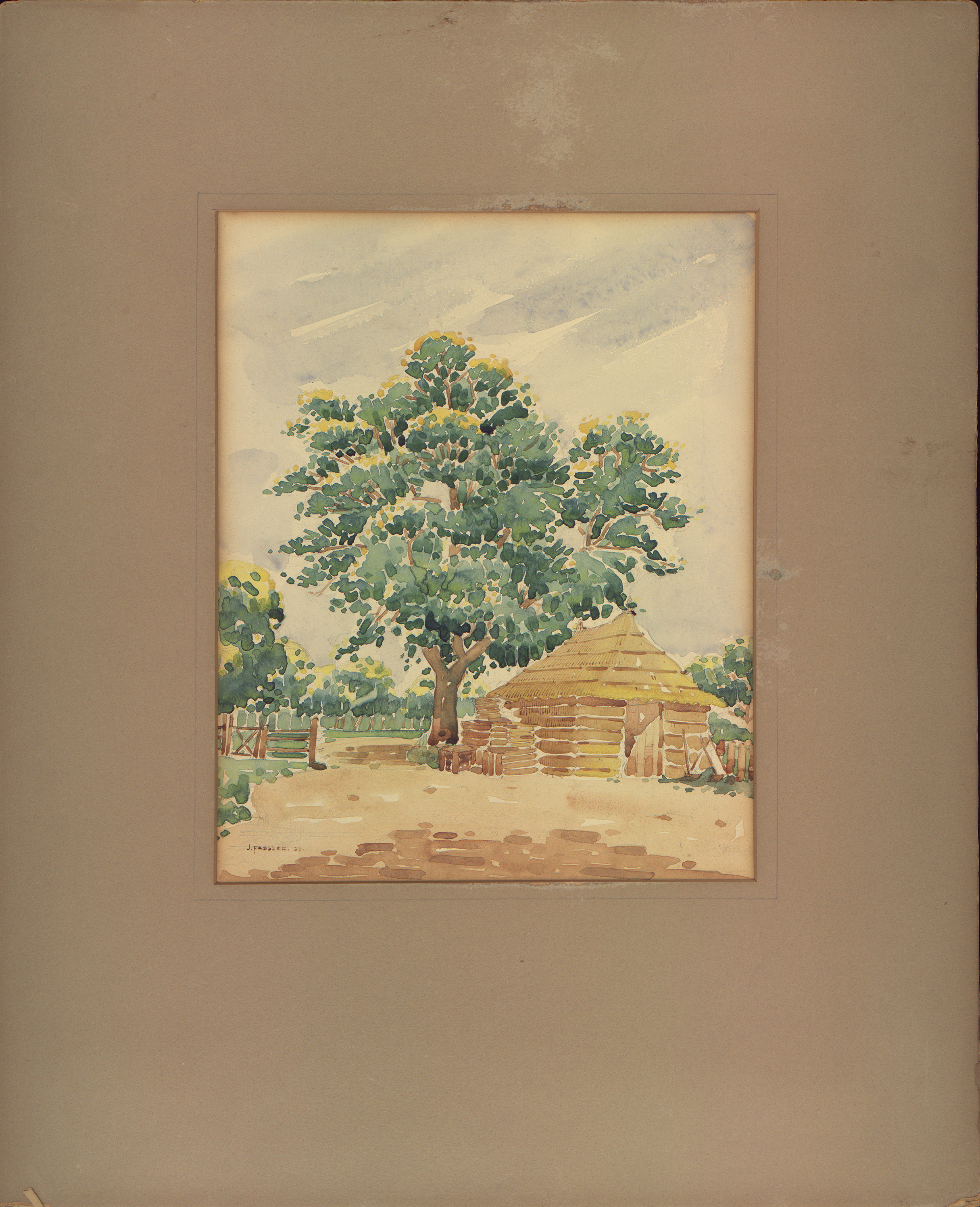 A typical water colour sketch of a rectangular grass hut and its setting.