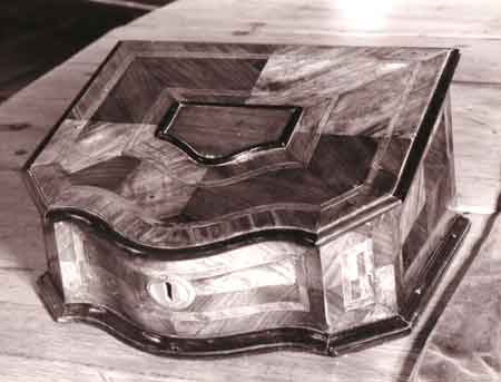 Photograph depicting a small and unusual box made from veneered and inlaid wood. It has splayed front corners and a simple Neo-classical escutcheon plate. Its purpose could be that of either a jewellery, document or writing box because it can be locked. More information welcome!