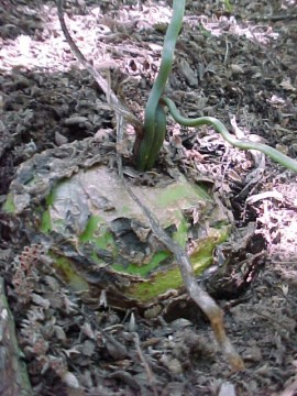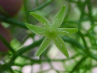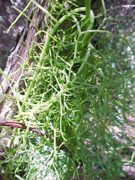 BOTANICAL DESCRIPTION: General: This plant has a greenish-white, fleshy tuberous bulb, without any papery or fibrous outer scales. The upper ends of the fleshy scales form distinctive rings around the middle of the bulb, from where the green leafless climbing and creeping branchlets arise. Leaves: Apparently leafless, but seedlings in their earliest stage produce 3 or 4 long thin leaves 2 - 3 mm wide and as much as 10 cm long. These leaves survive only until a small bulb has developed and are seldom seen. The succulent bright green branchlets, which will then develop, perform photosynthetic functions like true leaves. Flowers: The flowers are small, greenish-white stars 1-2 cm across. January - March. Fruit: Inconspicuous capsule 2x1 cm; seeds black, winged. March- April.