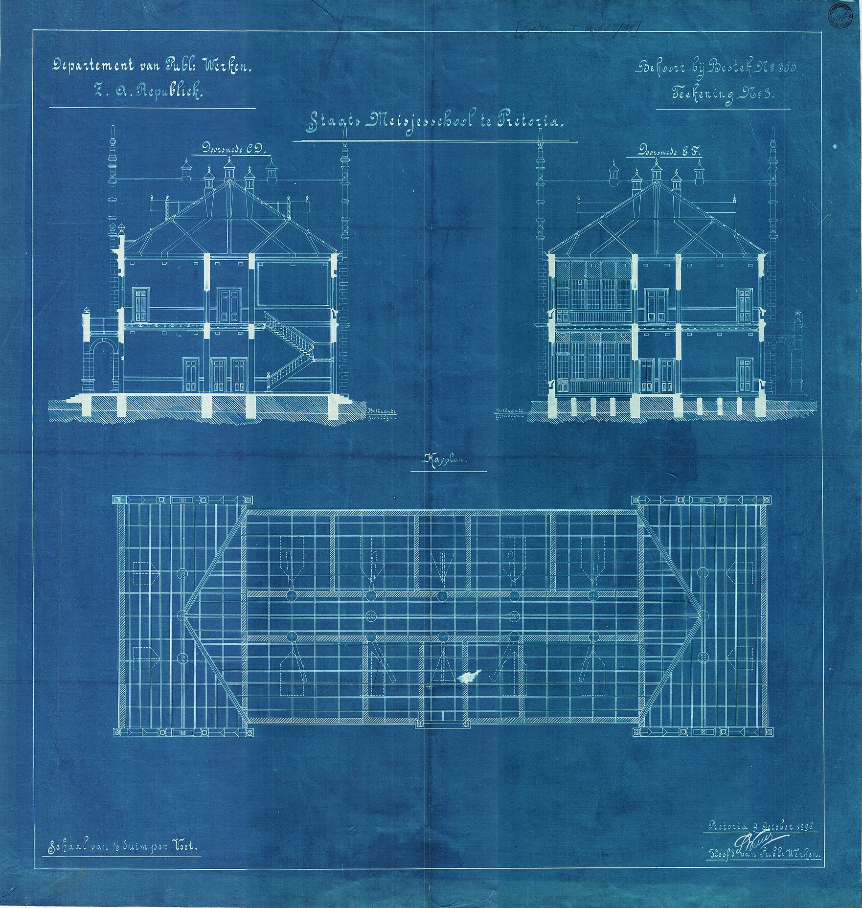 Digitised version of National Archive file S.3/858. Drawings: "Doorsnede, Kapplan, Staats Meisjesschool" (Section, Truss plan, State Girls' School), Pretoria. Signed by "S.W. Wierda, Hoofd van Publ.Werken"