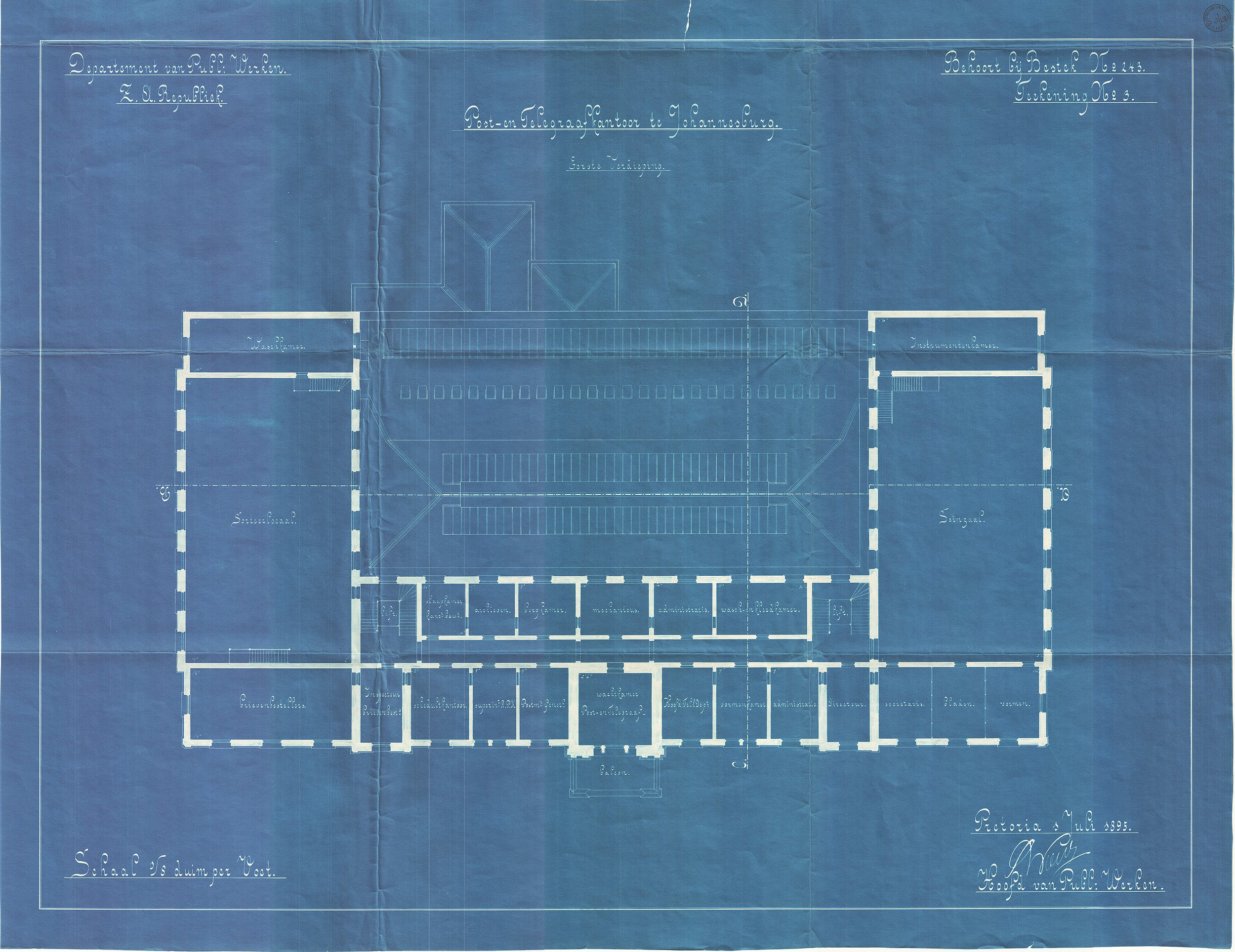 Digitised version of National Archive file S.2/131. Plan of the Post and Telegraph Office, Johannesburg, depicting the "Eerste verdieping" (First Storey), signed by "S.W. Wierda, Hoofd van Dept. van Publieke Werken"