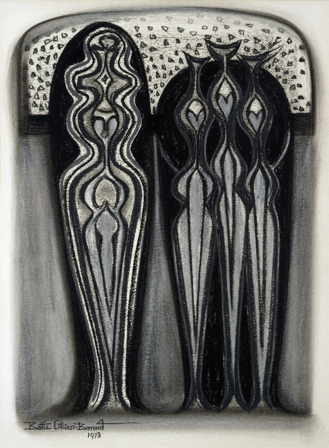 | dc.description | By 1973 Bettie Cilliers-Barnard was wholeheartedly engaged with representing humanity. The totem-like archetypical mother on the left of the picture plane stands within her space and is accompanied by her three totem-like daughters in their space capsule on the right. This pastel drawing is a preliminary study in which the artist develops her concepts for the many chess-like figures that were to follow. | en_ZA |