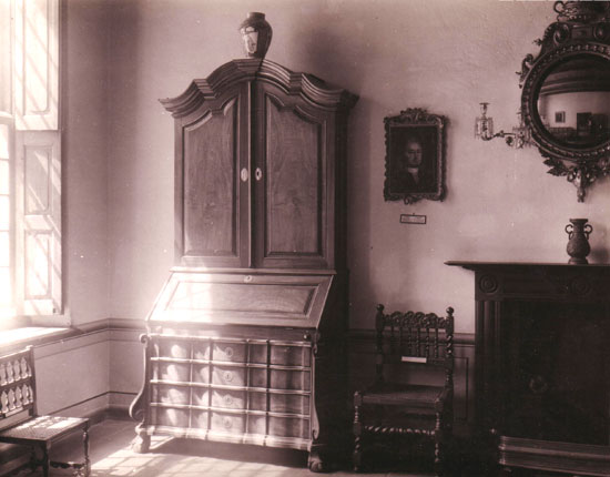 Photograph depicting at an escritoire with ball-and-claw feet, housed at Koopmans de Wet House. It has a decorative cornice and four drawers, the fronts of which are shaped in plan. See also Fig. 48 on p. 39 of the 1960 edition of prof. Geoffrey Pearce's book "Eighteenth Century Furniture in South Africa".