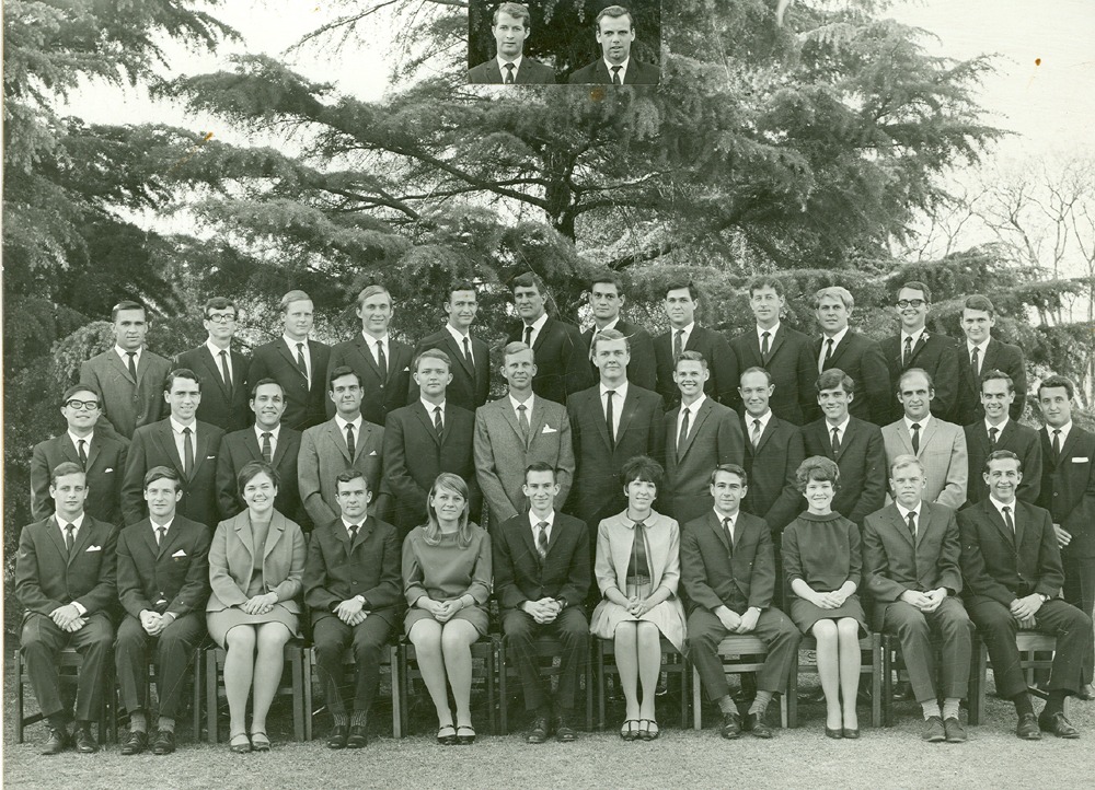 The photograph of the BVSC 1968 class is a formal black and white group photo. The names of the graduates on the photo are: Front (from left to right): RJ Petersen, THC Pritchett, SE Thomas, AG Norval, MM Kaales, FS Malan, DN Schott, NJ van der Merwe, AM McLellan, LF Banting, HS van der Walt ; Second row: GE Perchman, AR Deane-Berrell, RA Meintjes, DJ Moore, AJF Rogers, P Bland-van den Berg, JH Bowker, CH de Waal, T van der Merwe, MMT Kruse, JD Welton, RJ Taylor, SB Krawitz ; Third row: J du P Prinsloo, JG Whittington-Jones, RE Turner, JW Norman, KOP Shires, SS van den Berg, CJ van der Merwe, WGM Galliers, HP van Niekerk, PAB Loftus, PP Brandt, IV Schlesinger ; Insets: BA Corcoran, M Bootsma ;
