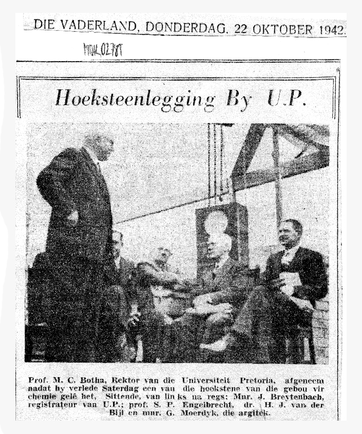 Hoeksteenlegging, Foundation stone, Botha, M.C., Moerdijk, Gerard, Chemie-gebou, Universiteit van Pretoria, Chemistry Building, University of Pretoria, Moerdyk, Gerard