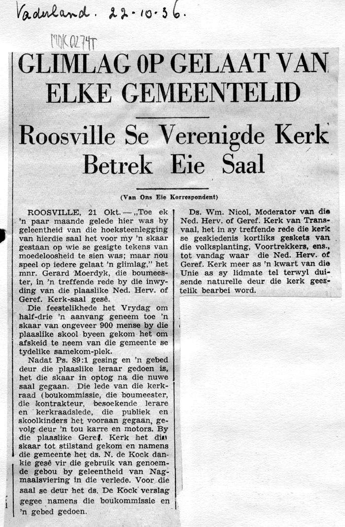 Moerdijk, Gerard, Roosville, Ned. Geref. Kerkgebou, Dutch Reformed church building, De Kock, N., Nicol, ds. W., Nederduits Hervormde of Gereformeerde Kerk van Transvaal, Moerdyk, Gerard