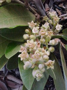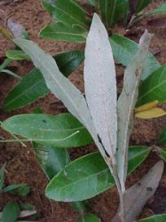 Parinari capensis: (Grysappel) Distribution: To be found in warm, sub-tropical, usually dry areas. In acid, sandy soil and on stony hills – not in marshy areas or clay soils. Usually part of a typical plant community which includes: Burkeana africa, Terminalia sericea and Ochna pulchra. Botanical description: General: Dwarf shrub with thick, woody subterranean rhizomes and thin upright aerial branches less than 30 cm high, appearing seasonally. The shallow underground rhizomes branch and radiate outwards, so that one plant may occupy a surface area of up to 3 m in diameter. Leaves: Alternate deciduous leaves, dark green above and silvery white below. Veins prominent on the underside. Small and narrow stipules leave minute scars on old stems. Stems usually with only two to five leaves. Flowers:Cream-coloured, hairy, borne in short,dense, branched inflorescences.Spring. Fruit: Succulent, egg-shaped, speckled grey. Edible.