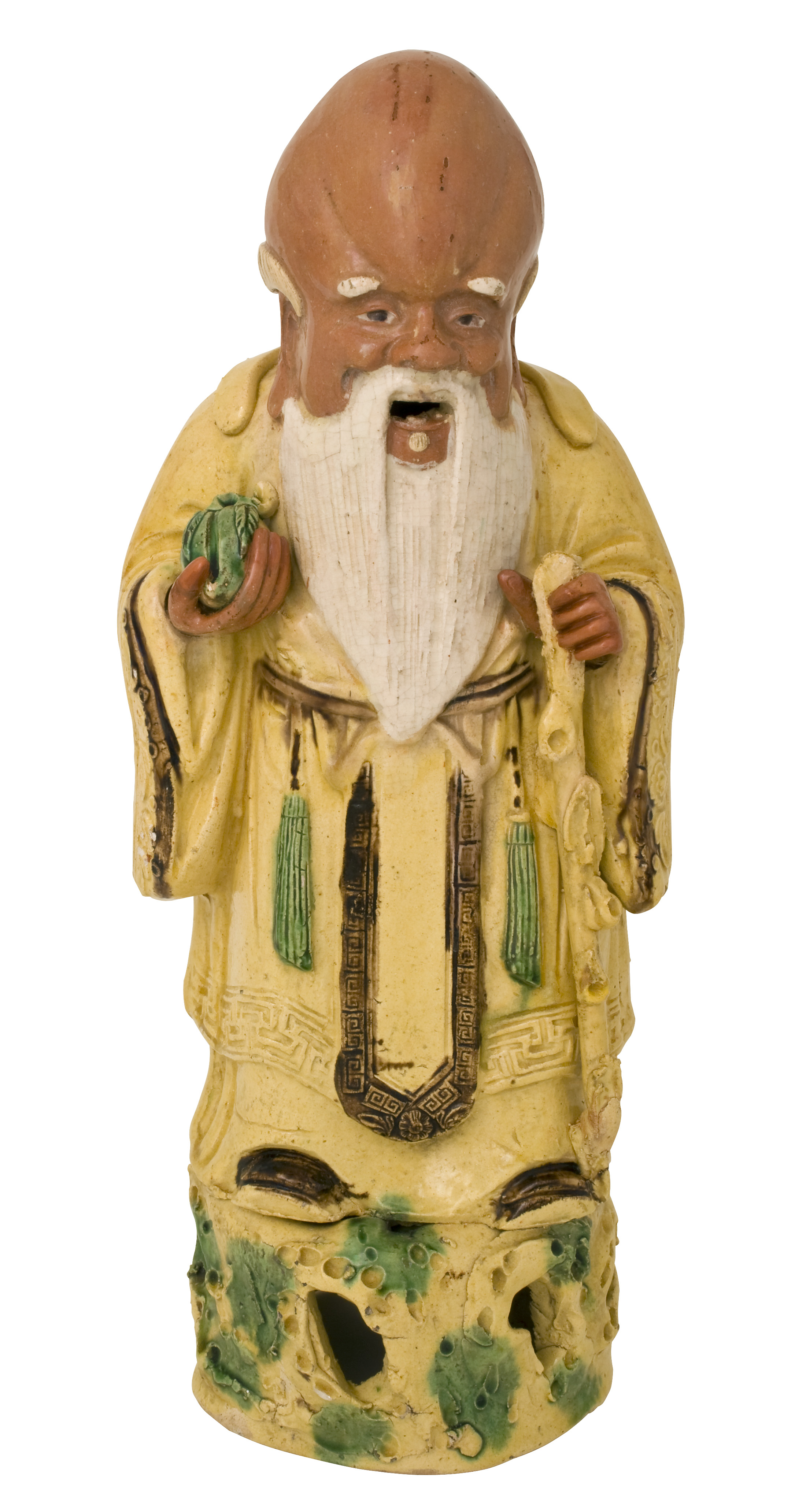This polychrome white porcelain figure of Fukurokuju is modelled with an enlarged forehead, long white beard and a flowing yellow robe with fret-motif borders and sash. He holds a green fruit in his right hand and a gnarled walking stick in his left. Fukurokuju was a famous sage of wisdom, wealth and long life. He stands erect, wearing formal robes with splendid fret brocade, has an unusually high bald forehead and a long white beard, as symbol of his longevity. His left hand grasps his emblematic staff, made of a gnarled peach branch, while his right hand holds the fruit of knowledge. He probably originated from an old Chinese tale about a mythical Taoist Chinese hermit sage (Song dynasty) renowned for performing miracles. Mr Van Tilburg placed this figure in a darkened room and told visitors that the head had phosphor under the glaze and would glow when the light was switched off. When he did this and no one could see the glow, he would laugh and say: “It was written that only those who were pure of heart could see the glow”.