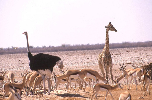Springbok, ostrich and giraffes at a waterhole, Etosha National Park, Namibia - July 1988