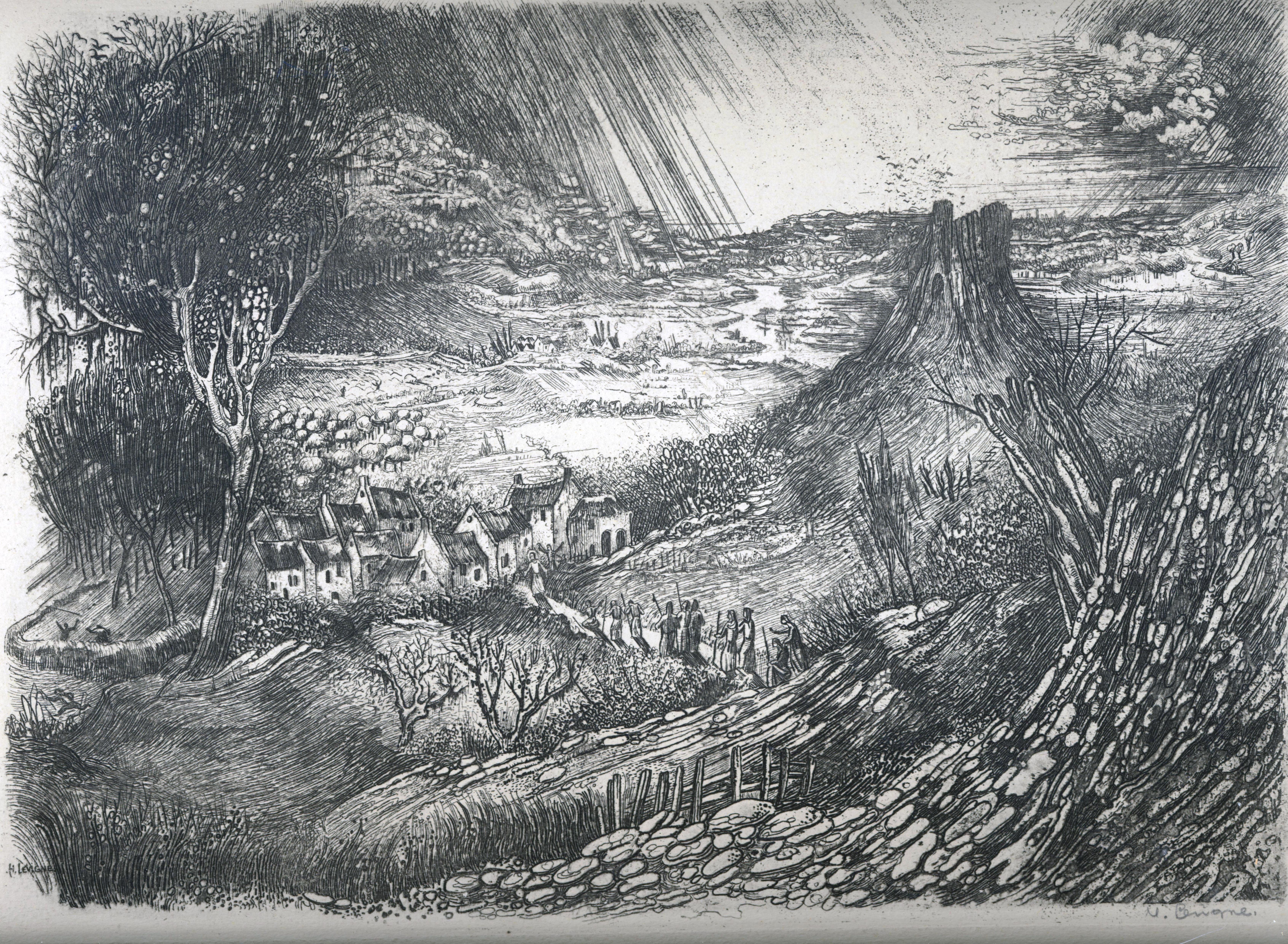 Dry needle etching of Jesus entering a town with the ten lepers following with the suns rays shining on the landscape. Signed on plate bottom left and signed in pencil bottom right.