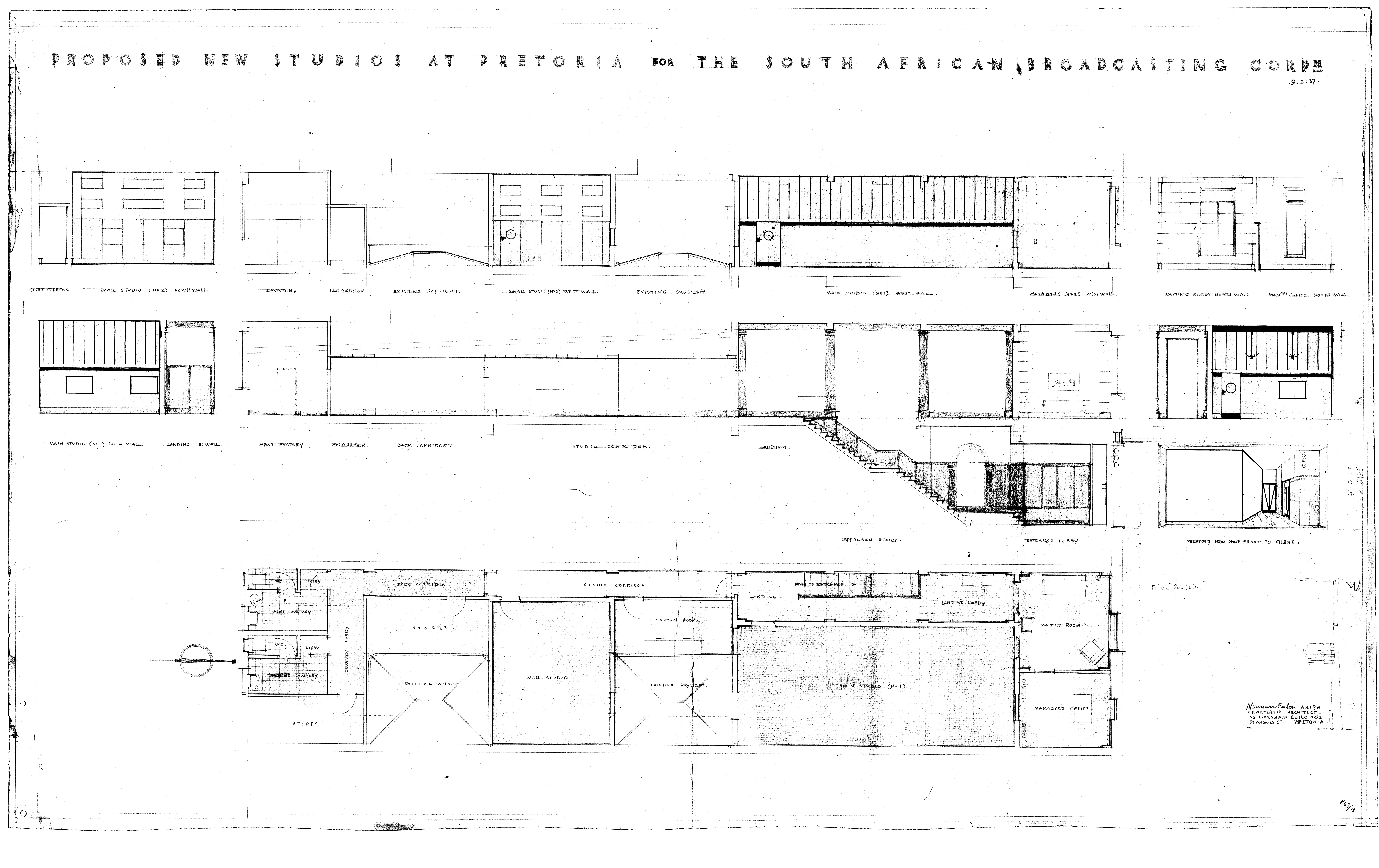 Plans, sections and elevations of proposed new studios at Pretoria for the South African Broadcasting Corporation (SABS).
