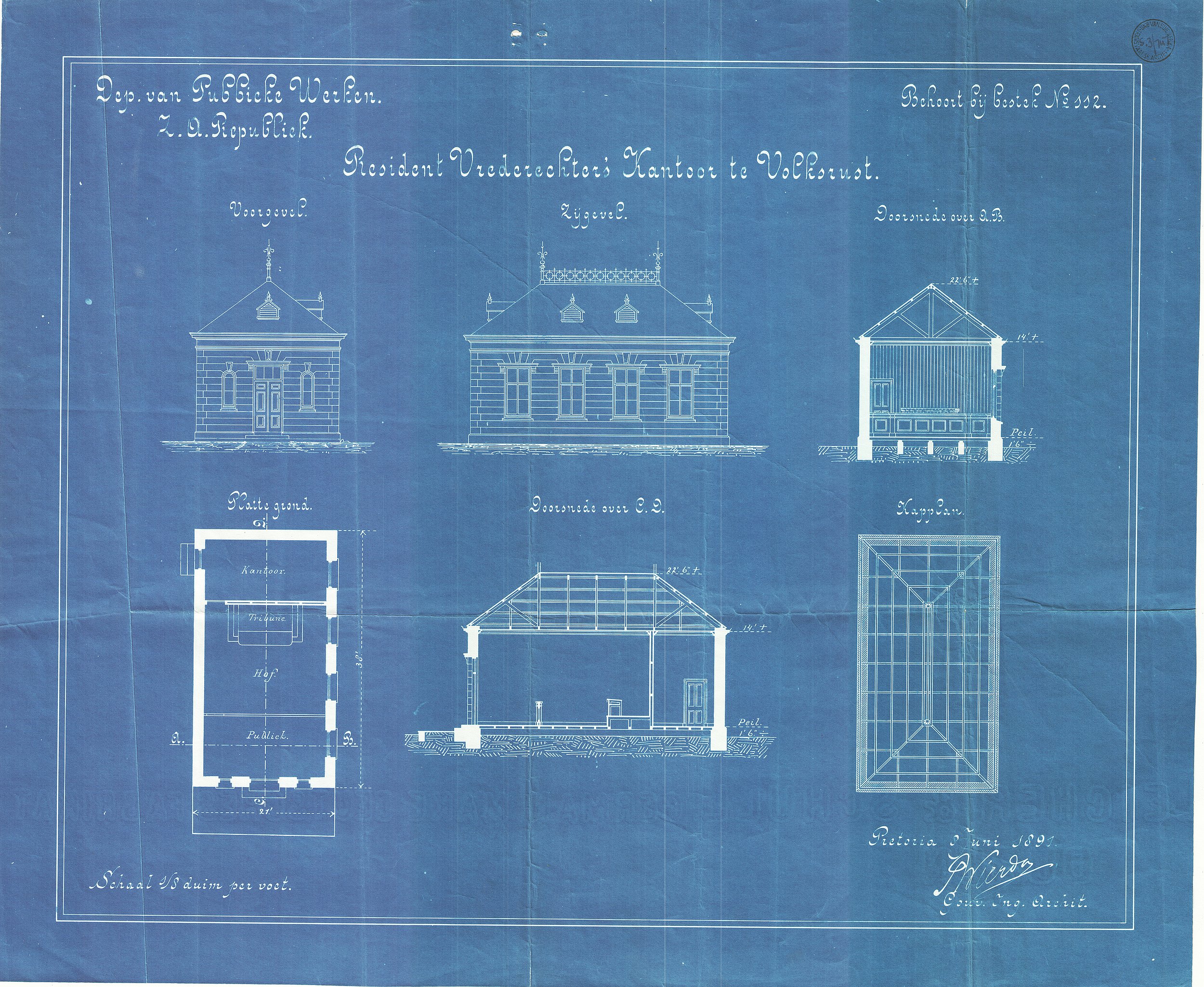 | dc.description | Digitised version of National Archive file S.3/747. Drawings of the Magistrate's Office, Volksrust, signed by "S.W. Wierda, Gouv. Ing. Archit" | en |