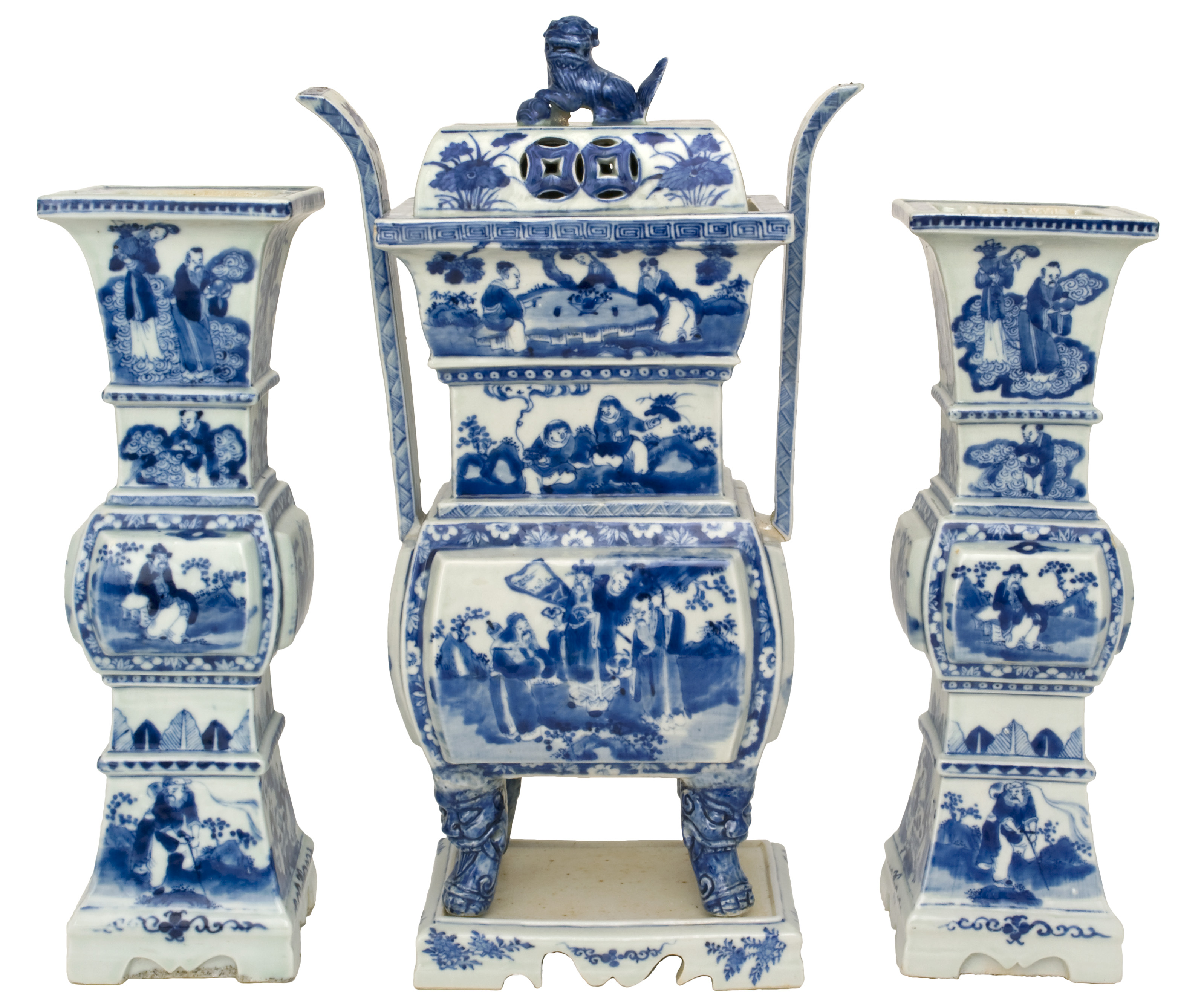 Chinese Qing dynasty blue and white set of garniture vases