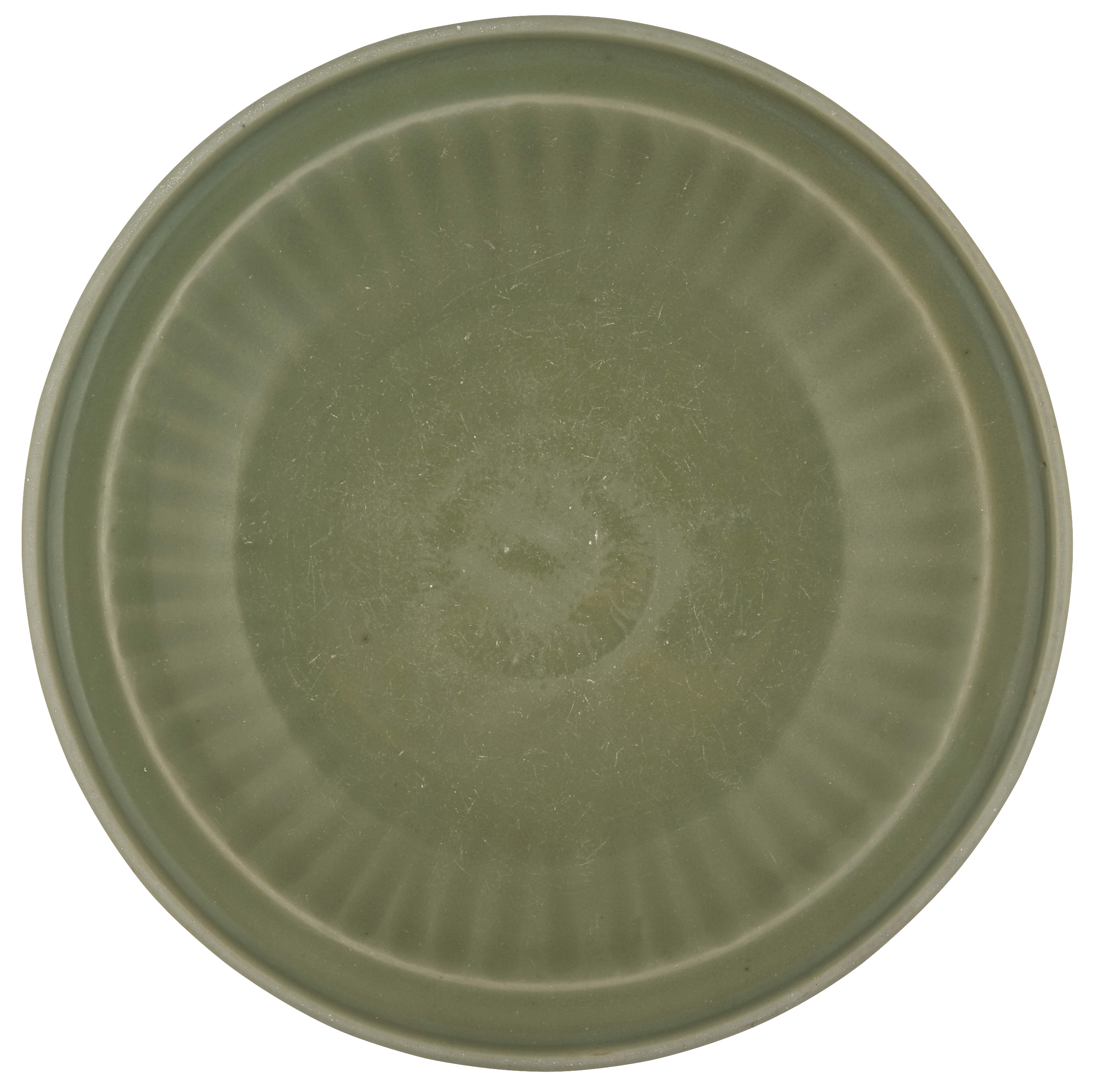 This sturdy round rather heavily potted Longquan celadon stoneware dish with lobed sides and celadon glaze is decorated inside in the centre with an impressed floral design surrounded by fluted sides under a thick olive-green celadon glaze. The base is sunken, partly glazed and unmarked. The body is burnt brown in the unglazed ring inside the recessed base. This type of Longquan celadons have been found at many ancient African sites in the interior of sub-Saharan Africa, including Mapungubwe. They were brought there by Arab traders, who traded directly with China at the time, and believed that if poisonous food or drink was placed in a celadon container, the glaze would change colour.