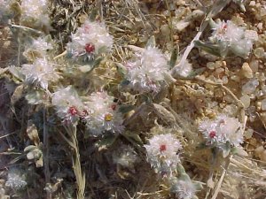 BOTANICAL DESCRIPTION: General: An annual herb with radiating, flat, woolly stems growing flat on the ground like a mat, up to 150 mm high. Leaves: Leaves are spoon - shaped and hairy Flowers: Flower heads are characteristic - round like a ball with transparent bracts of which the outer rows are shiny silvery and the centre rows are pink, turning white and papery with age. Fertile flowers have yellow centres.