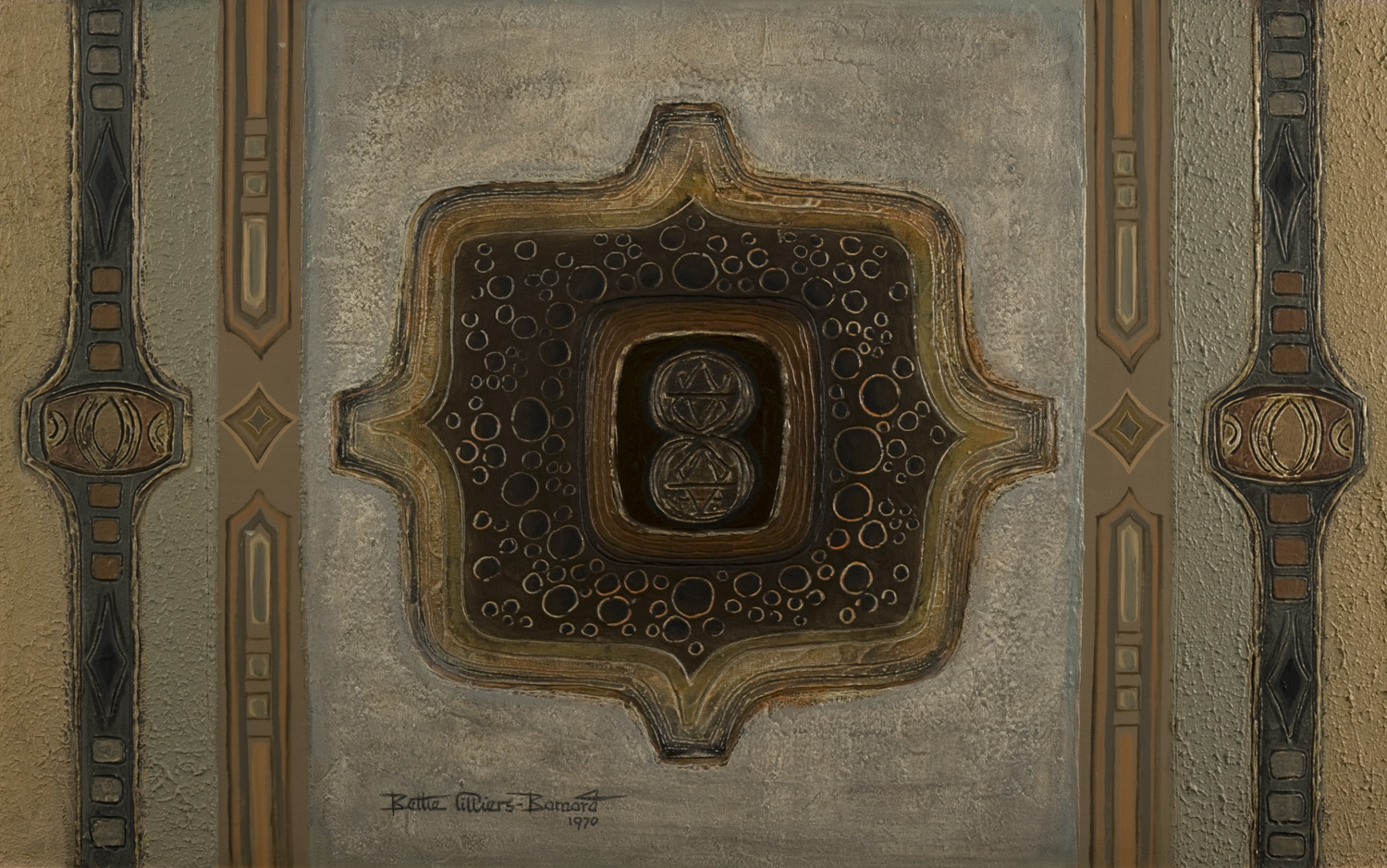 In this work the much used circle becomes a cross. In its marvelously ordered symmetry and the simplicity of the cruciform composition, executed in bas-relief, this work reminds one of the magnificent book covers of the Koran. The cryptic writing inside the platter heightens the effect of the title of the work.