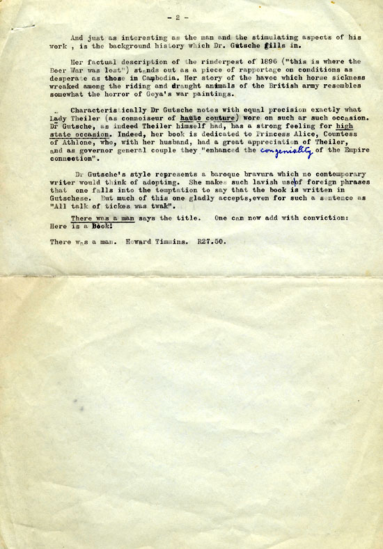 Newspaper report by Rykie van Reenen on the book "There was a man" by Thelma Gutsche. This is a translation from Rapport of 16 December 1979, typed and corrected by Theiler's daughter.