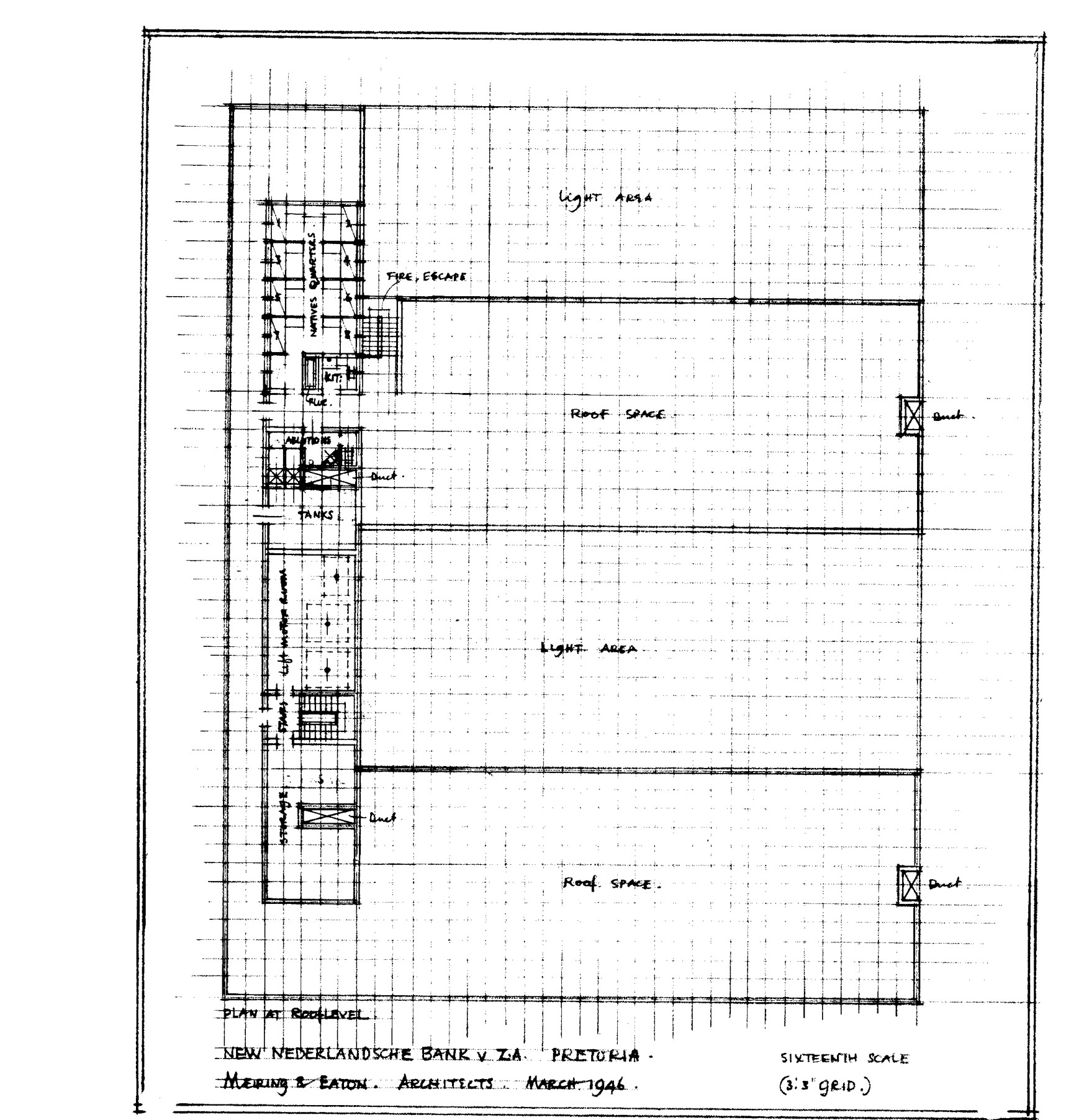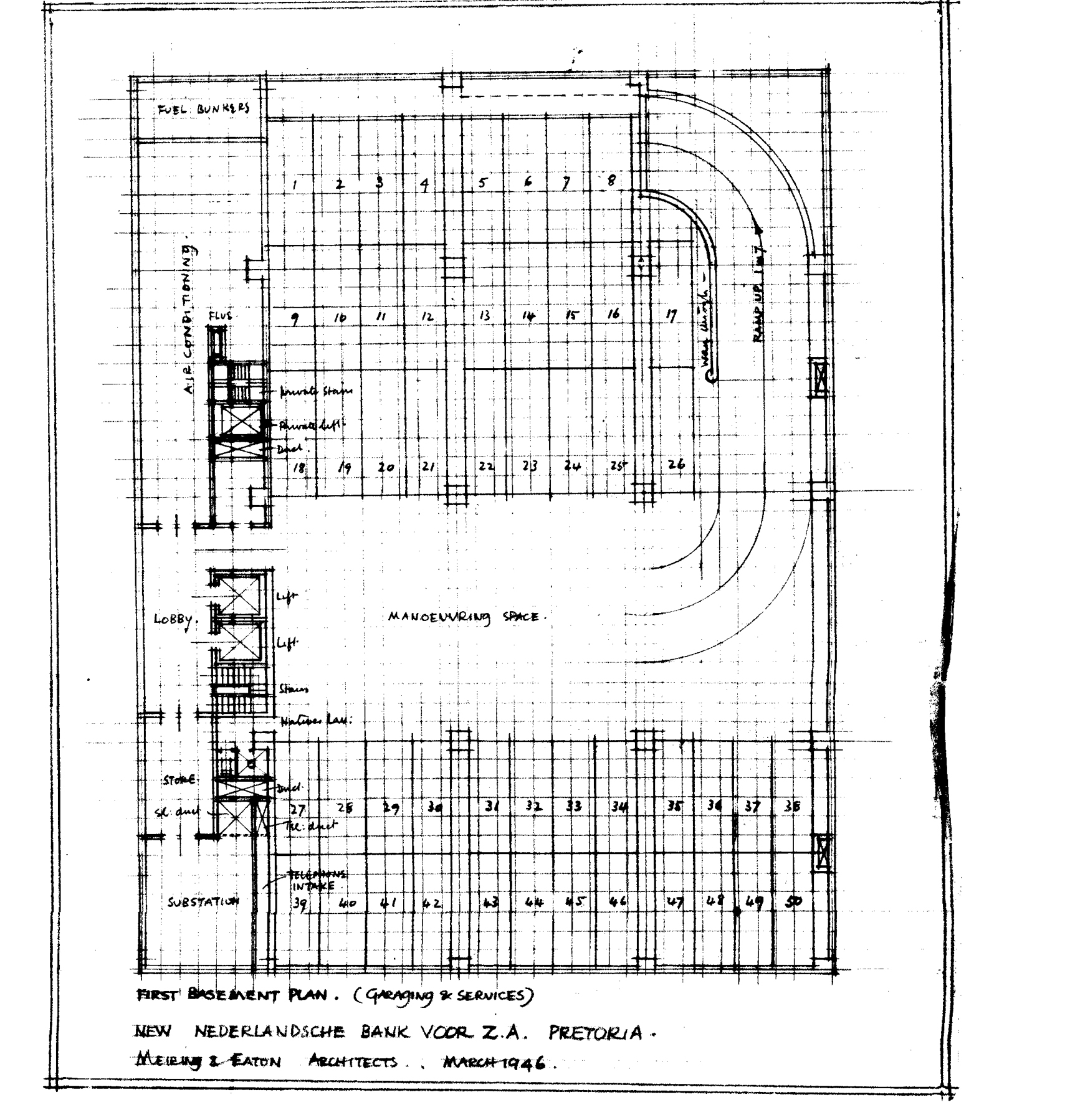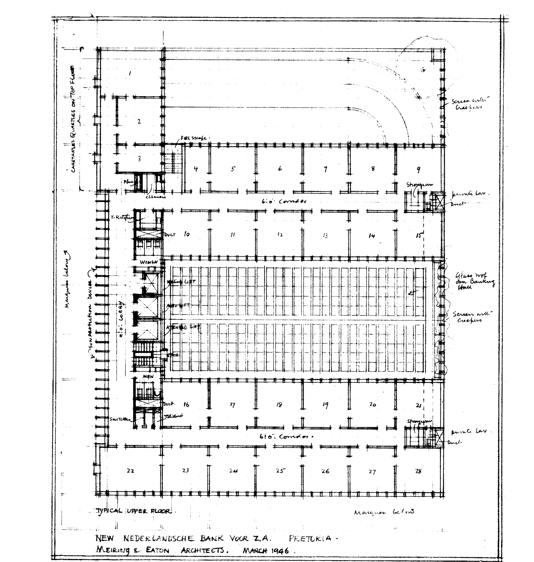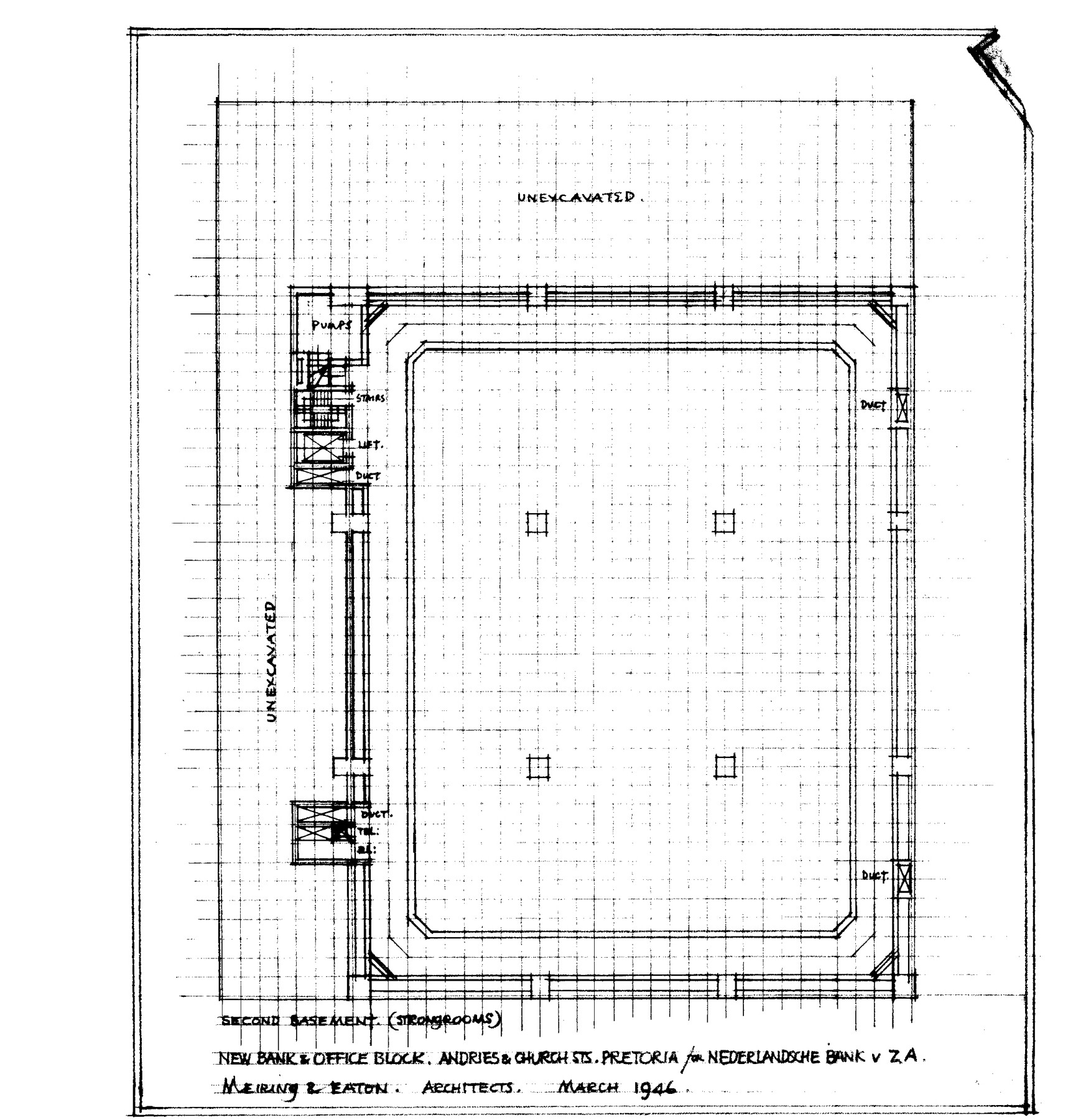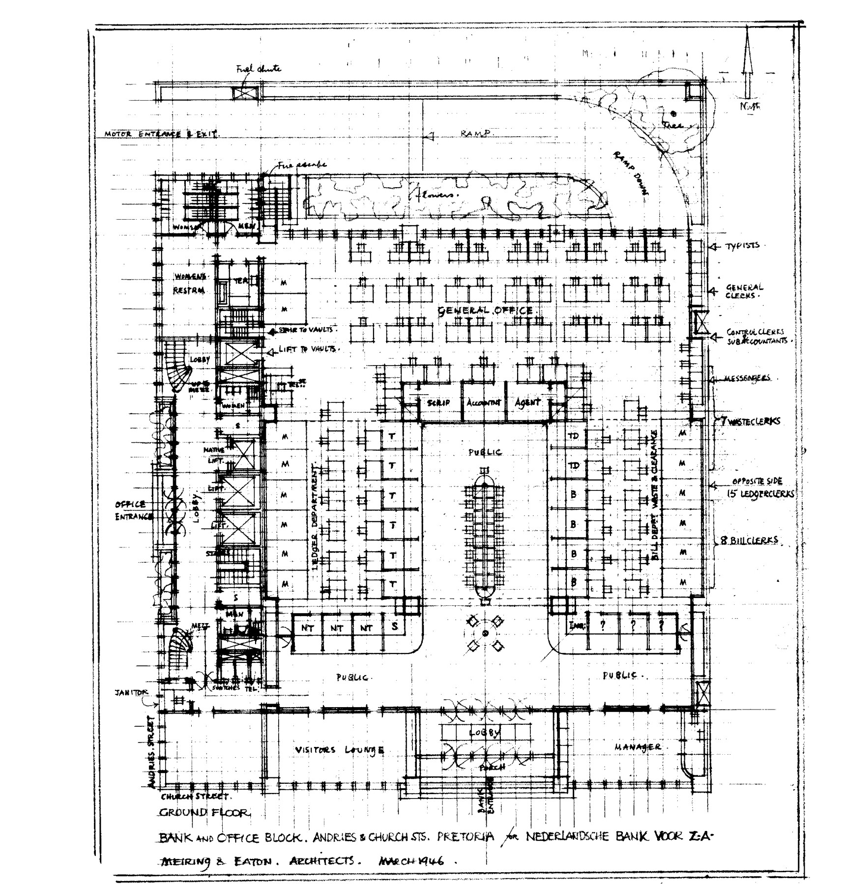 Drawings of the Nederlandse Bank, Pretoria in March 1946, including: