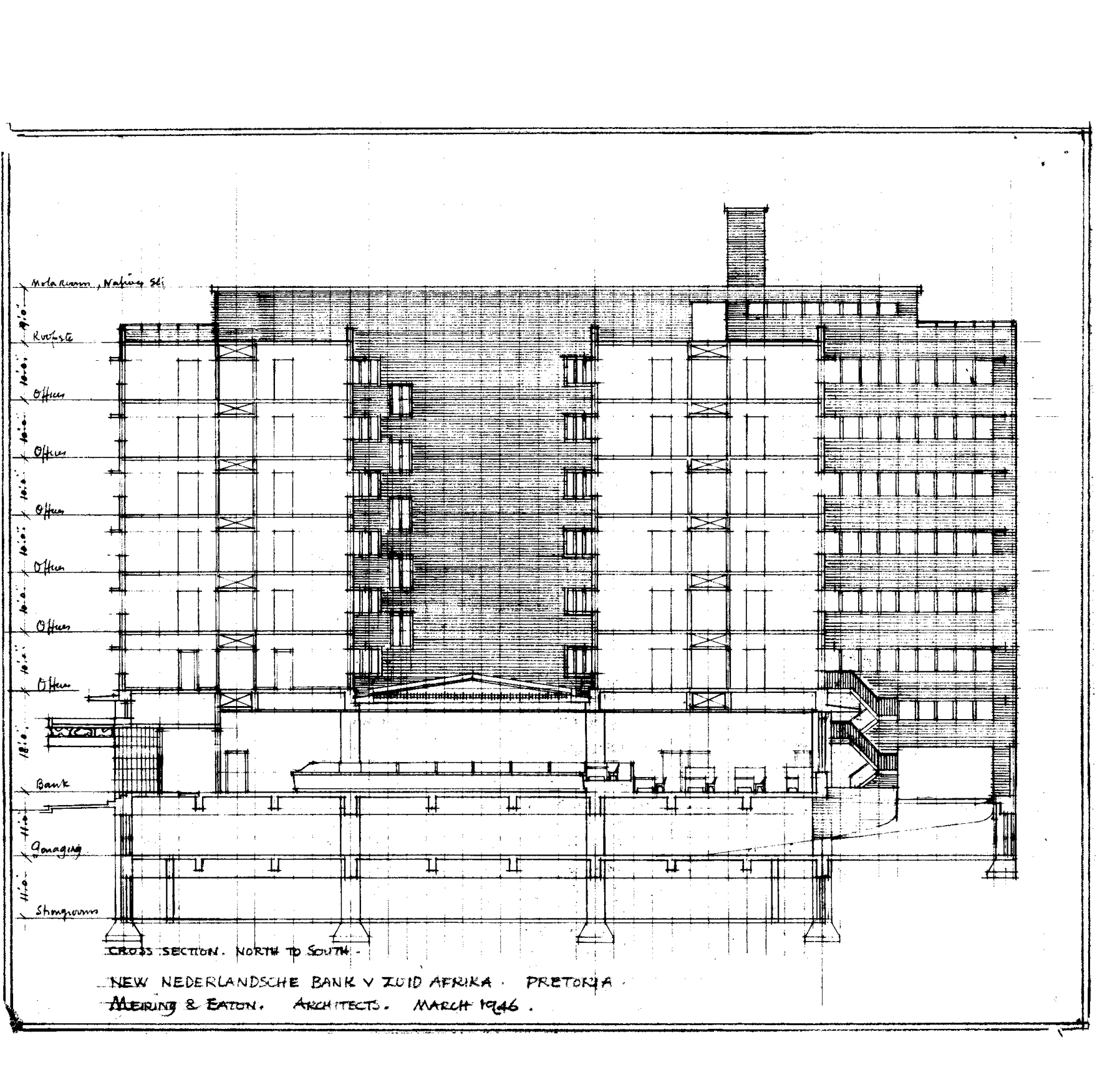 Eaton, with Professor A.L. Meiring in the background, began planning the new building, which would be erected during 1952-5. Eaton stressed from the outset that the design would be dissimilar to those customarily associated with bank buildings in the past, where the use of an architectural style had been a prerequisite. Offices would be sheltered from the hot summer sun, and a wide protective cantilevered canopy would be placed over pavements to protect pedestrians from the elements. From the outset, Eaton therefore carefully considered the local climate in the planning of spaces and resultant facades. Along with a proposed basement car parking area, the projecting canopy had to be excluded on the insistence of the client – they had apparently felt that especially the latter would be inappropriate for a bank building (Harrop-Allin, 1975: 90).