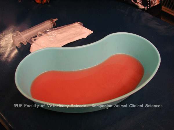 PHOTO 1: Chylothorax is the accumulation of chyle from the thoracic duct in the thoracic cavity. The fluid contains triglycerides, lymphocytes, protein and fat soluble vitamins. The accumulation of chyle is due to abnormal pressure in the thoracic duct which leads to exudation of chyle from intact but dilated thoracic lymph vessels. The chylous effusion causes fibrosing pleuritis which interferes with the ability of the lungs to expand. On physical examination the heart and lung sounds are muffled, there are increased bronchovesicular sounds; cyanosis and pale mucous membranes can be seen. Traumatic chylothorax may occur if trauma causes the thoracic duct to rupture. Non traumatic chylothorax may be caused by generalized lymphangiectasis, inflammation or obstruction of lymphatic flow by neoplasia or increased venous pressure. Other causes of non traumatic chylothorax include mediastinal lymphoma in cats, cardiomyopathy, pericardial disease, right heart failure, lung lobe torsion and diaphragmatic hernia. Congenital chylothorax predisposes to chylothorax later in life. Traumatic events like surgery or being hit by a car can cause chylothorax in these animals. Clinical signs of chylothorax include respiratory distress, lethargy, anorexia, weight loss and exercise intolerance. Thoracocentesis and fluid therapy are used to stabilise animals with chylothorax.