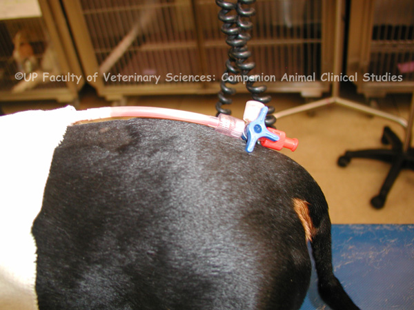 | dc.description.abstract | PHOTO 1: Chylothorax is the accumulation of chyle from the thoracic duct in the thoracic cavity. The fluid contains triglycerides, lymphocytes, protein and fat soluble vitamins. The accumulation of chyle is due to abnormal pressure in the thoracic duct which leads to exudation of chyle from intact but dilated thoracic lymph vessels. The chylous effusion causes fibrosing pleuritis which interferes with the ability of the lungs to expand. On physical examination the heart and lung sounds are muffled, there are increased bronchovesicular sounds; cyanosis and pale mucous membranes can be seen. Traumatic chylothorax may occur if trauma causes the thoracic duct to rupture. Non traumatic chylothorax may be caused by generalized lymphangiectasis, inflammation or obstruction of lymphatic flow by neoplasia or increased venous pressure. Other causes of non traumatic chylothorax include mediastinal lymphoma in cats, cardiomyopathy, pericardial disease, right heart failure, lung lobe torsion and diaphragmatic hernia. Congenital chylothorax predisposes to chylothorax later in life. Traumatic events like surgery or being hit by a car can cause chylothorax in these animals. Clinical signs of chylothorax include respiratory distress, lethargy, anorexia, weight loss and exercise intolerance. Thoracocentesis and fluid therapy are used to stabilise animals with chylothorax. PHOTOS 2-3: A chest drain (thoracocentesis) may be necessary to stabilize an animal suffering from chylothorax. Chest drains may be required every 1 to 2 weeks in the initial stages of treatment. The length of intervals of thoracocentesis will depend on the owners’ observation of when the animal displays signs of increased respiratory effort or decreased activity. If the patient responds well to medical management the intervals of thoracocentesis can be gradually decreased. PHOTOS 4-9: Pericardial tap or pericardiocentesis is the use of a catheter to remove a volume of pericardial effusion for diagnostic and therapeutic purposes. It is used when pericardial effusion causes cardiac tamponade and when a pericardial effusion of unknown aetiology is present. It may also be necessary to remove chyle from the pleural cavity in animals suffering from chylothorax. Ultrasound guidance prior to the procedure to locate an area of maximal pericardial effusion and minimal lung is useful. The animal is placed in left lateral recumbency and ultrasound is used to confirm that pericardial effusion is present in sufficient volume for centesis. The area is widely clipped and aseptically prepared. The site for centesis is again confirmed via ultrasound. The area is infused subcutaneously, intramuscularly and subpleurally with Lidocaine. A syringe-catheter-stylet combination is advanced while drawing back on the syringe plunger to create negative pressure. A flashback of effusion is seen in the syringe and the needle is advanced 2-3 mm further into the chest. The catheter is advanced a few centimetres further into the pericardial space. The effusion is withdrawn using a large volume syringe until the pericardium is empty. Once the effusion has been removed the catheter is withdrawn. The skin incision may be closed using tissue glue. | en |