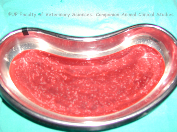 - Photo 9: Pink blood tinged chyle with yellow floccules floating on top
