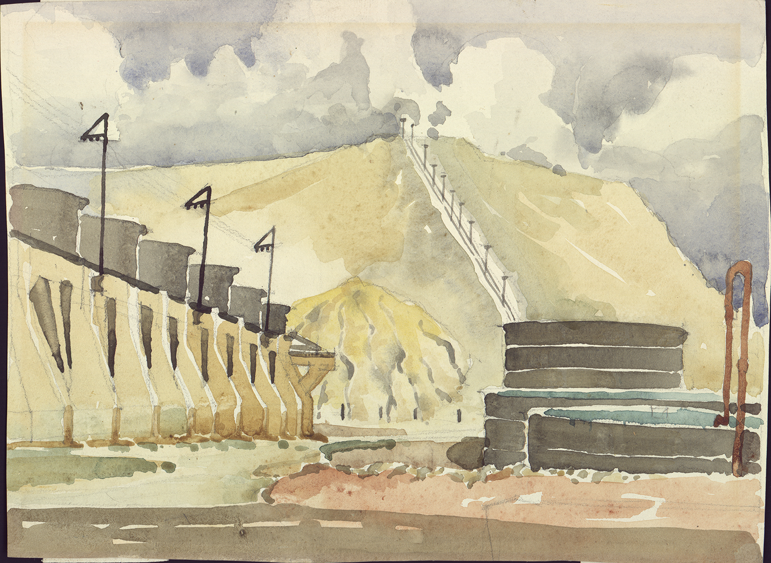 A painting reflecting the juxtapositions and structures of the mining landscape with which, through his Wemmer Pan training as oarsman in the University's rowing Team, John Fassler was in constant contact.