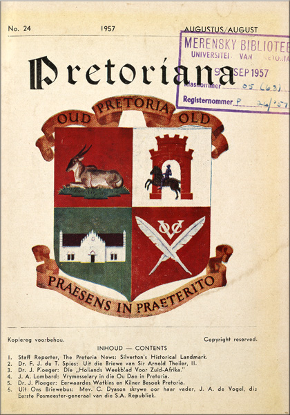 Silverton's historical landmark -- Uit die briewe van Sir Arnold Theiler II / F.J.du T. Spies -- Die Hollands weekblad voor Zuid-Afrika / J. Ploeger -- Vrymesselary in die ou dae in Pretoria / J.A. Lombard -- Uit ons briewebus