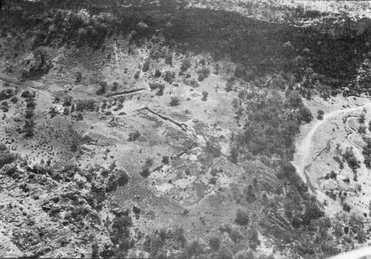 An aerial view of the K2 site from the south-west. Gardner's large scale excavations can be seen in the centre. The midden known as K1 is situated on the lower valley floor to the right.