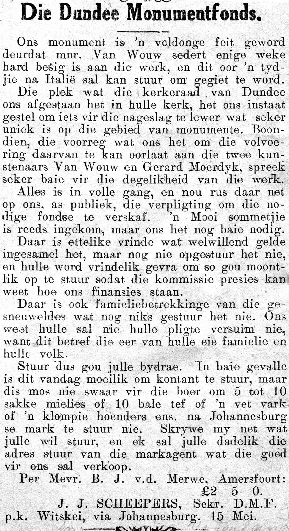 'n Versoek vir bydraes tot die fonds vir die oprigting van die monument in Dundee wat deur Gerard Moerdijk en Mnr. Anton van Wouw ontwerp is.