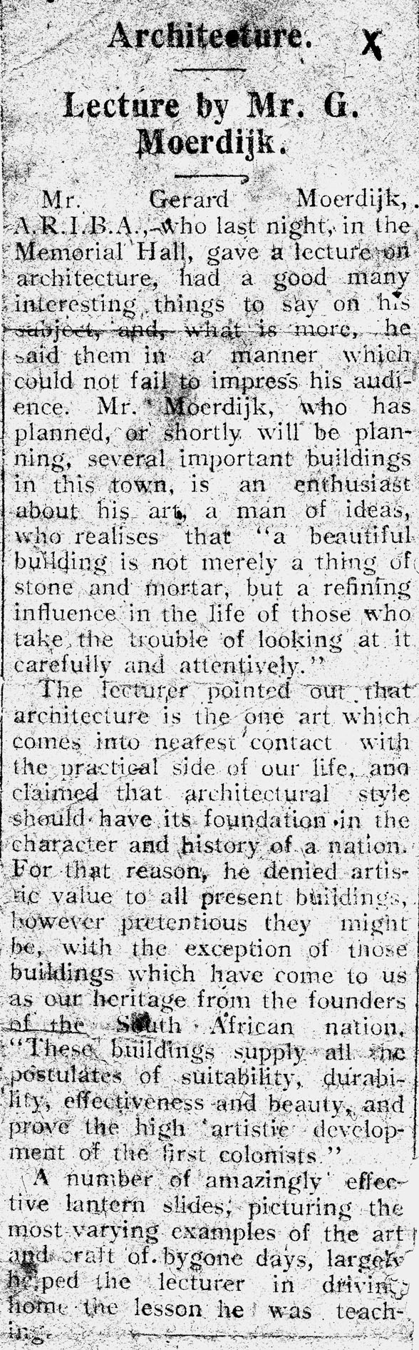 | dc.description.abstract | Mr Gerard Moerdijk gave a lecture on architecture in the Memorial Hall, highlighting the importance that the history of a nation should be included in architectural designs. | en |