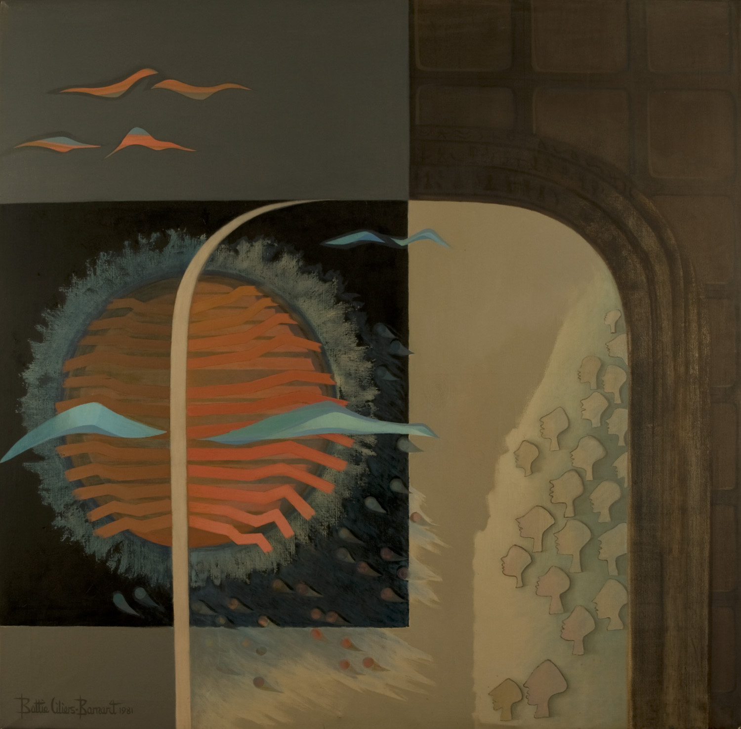 This painting is very typical of Bettie Cilliers-Barnard’s use of image, form and colour at the time. The whole picture plane is divided into broad geometric colour planes in which images are trapped and freed. The gateway or “poort” invites one in, the bright orange and blue sun holds promise and the gull-like birds signify freedom of choice. To the right profiled heads stare in anticipation.