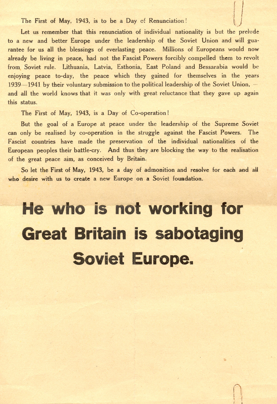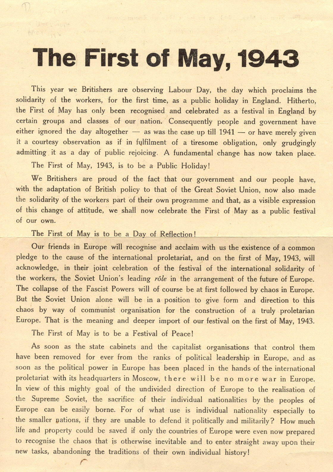 Propaganda pamphlet from the Second World War on Labours Day.